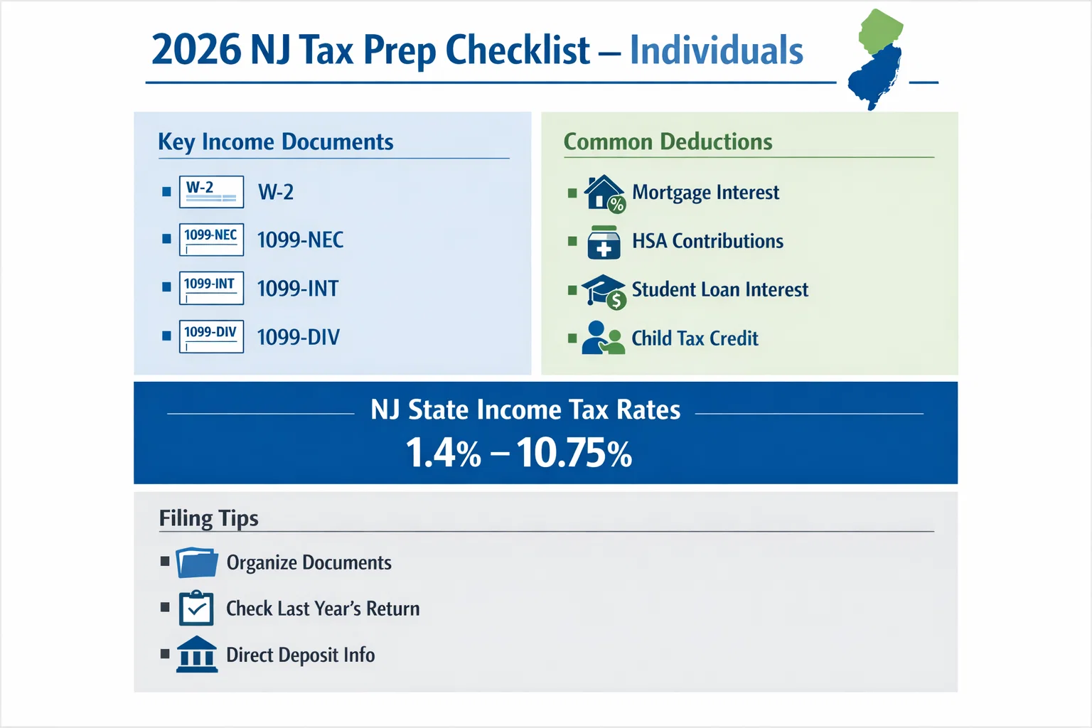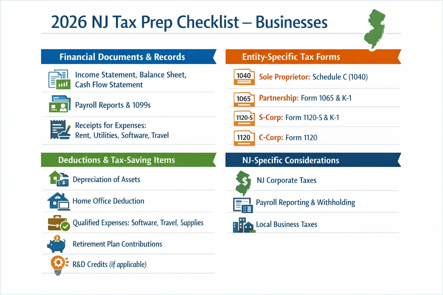 This complete 2026 tax prep checklist for New Jersey residents helps you organize every document, maximize deductions, and stay compliant, whether you’re filing as an individual, running a business, or living abroad.