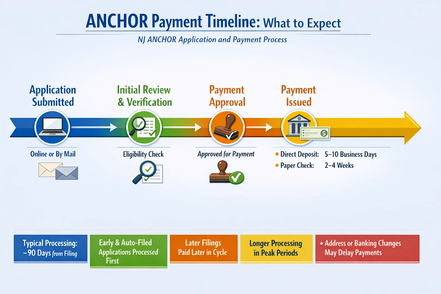 For ANCHOR applications filed in 2025, most eligible New Jersey homeowners and renters can expect their ANCHOR payment to be issued in 2026. The New Jersey Division of Taxation processes ANCHOR benefits on a rolling basis, meaning there is no single statewide payment date.