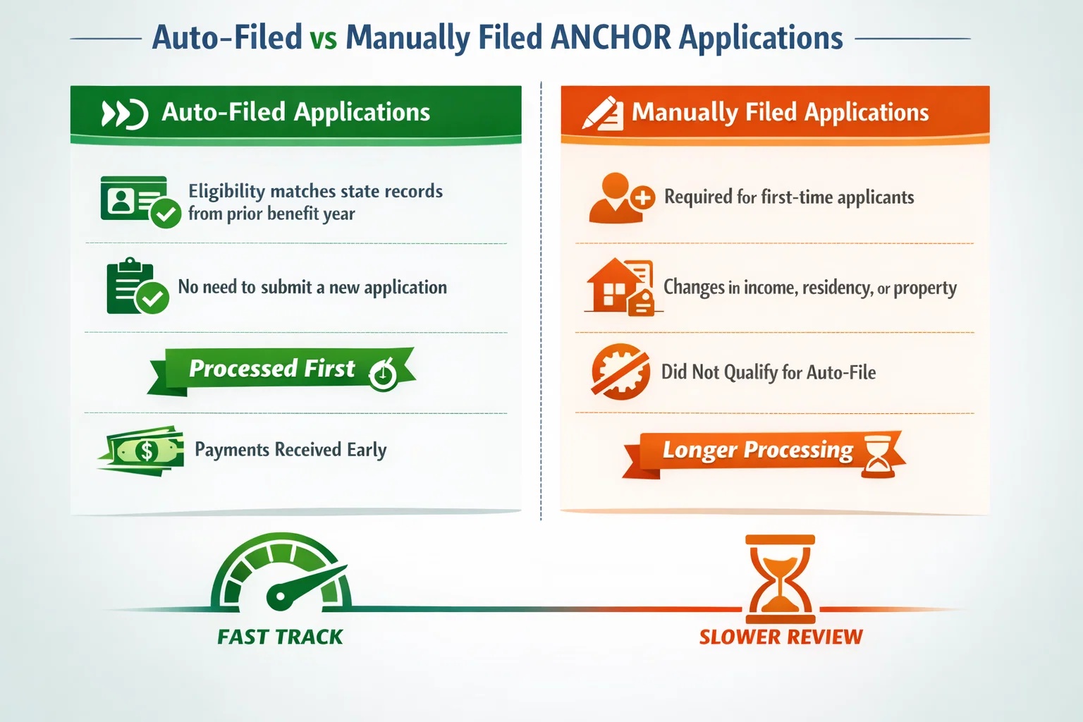 Only one ANCHOR benefit is issued per eligible property, even if multiple owners are listed. Situations involving joint ownership, partial-year residency, marital changes, or property transfers may require additional review and can affect processing timelines.